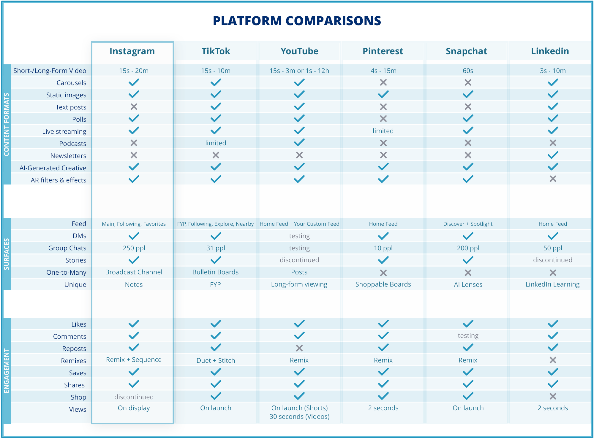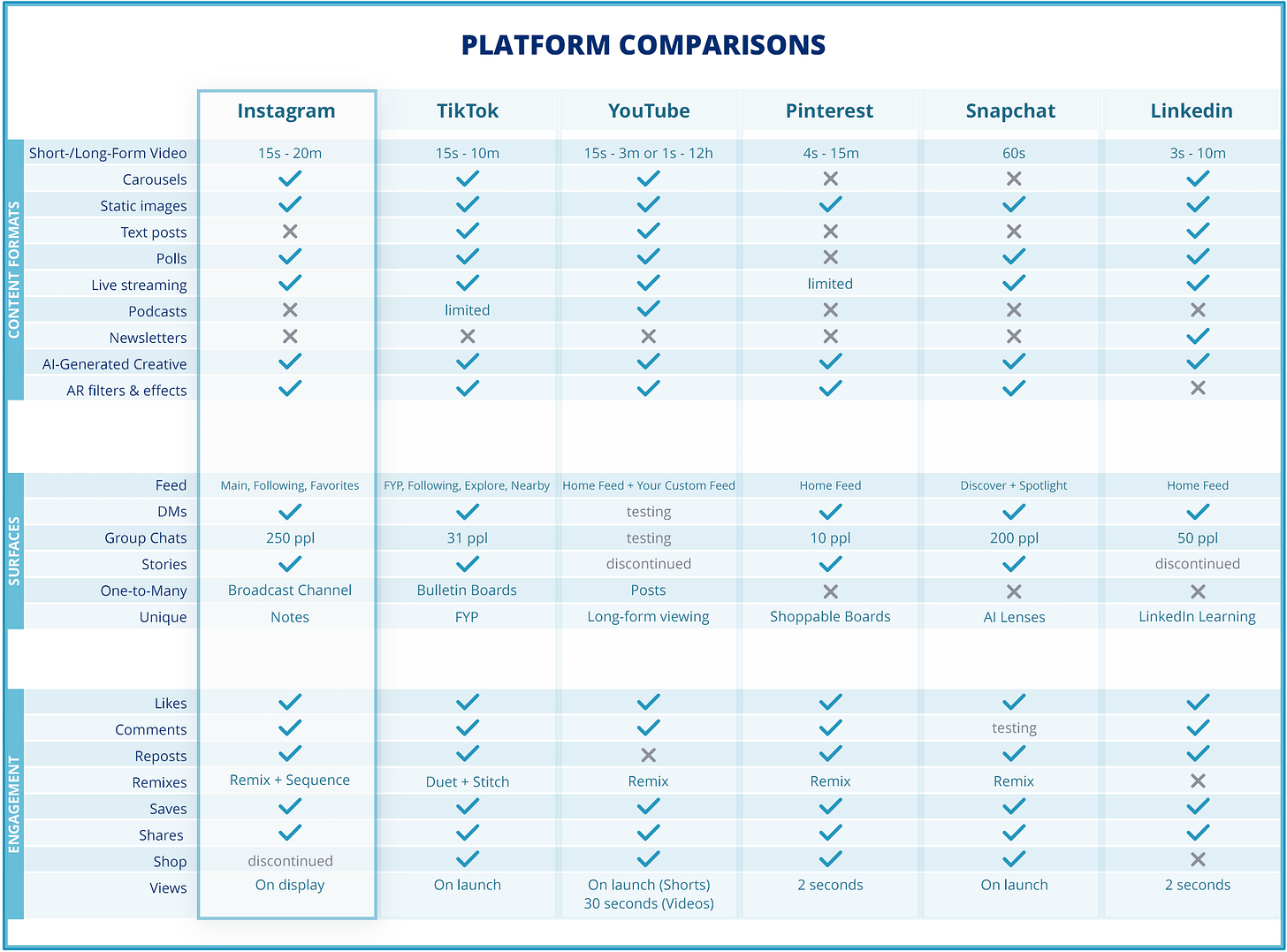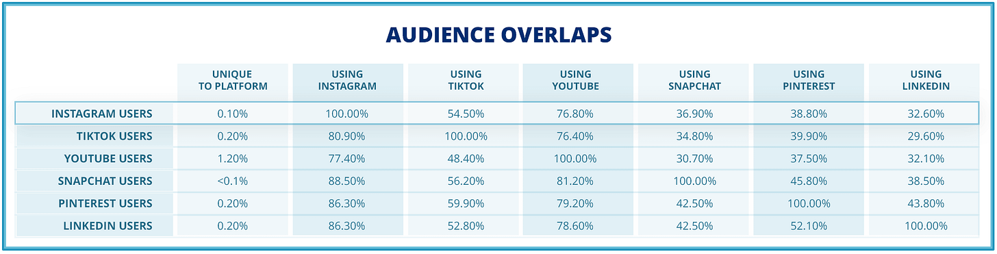The average person now uses 6.75 platforms a month â with plenty of audience and feature overlaps across them. The charts below show where Instagram, TikTok, YouTube, Snapchat, Pinterest, and LinkedIn intersect, and where they differ in formats, surfaces, and engagement so you can decide where your time actually matters.